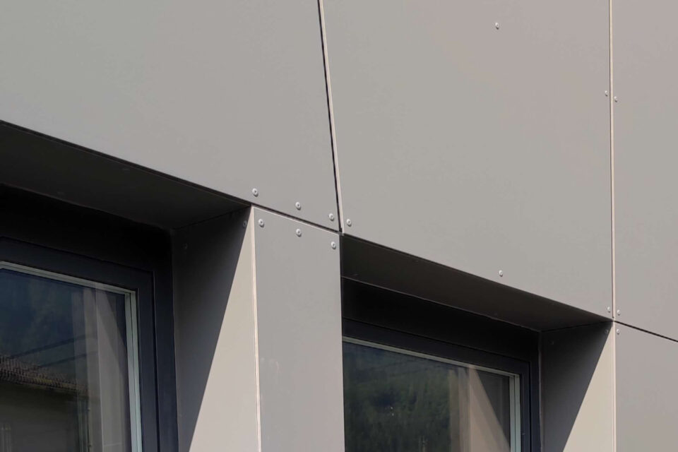 In seguito all’ampliamento del CFP Enaip di Tione di Trento per il laboratorio di pasticceria, la facciata è stata rivestita con pannelli HPL spessi 8 mm, di colore Grigio Cenere. I pannelli sono stati divisi in lastre verticali, con tagli diagonali, conferendo un design moderno e funzionale all’edificio.