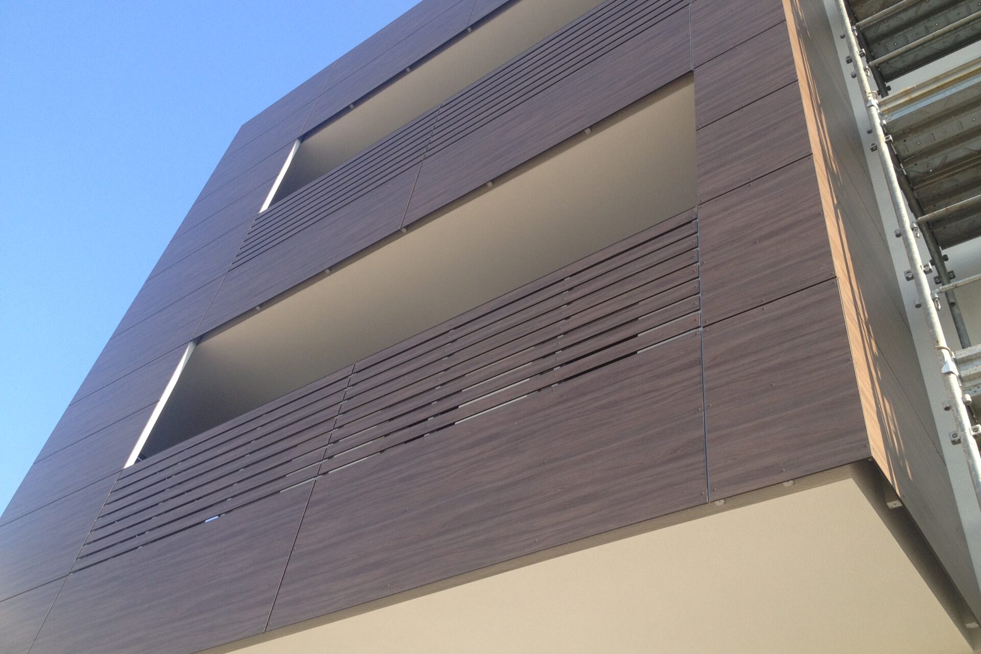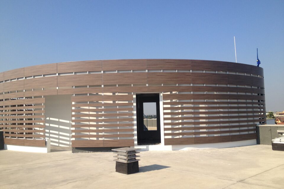 E’ costituito da una parte lineare con parapetti a doghe in hpl sulla parte frontale e a pannello pieno sul perimetro, e una parte curva costituita da frangisole in hpl tinta legno.
