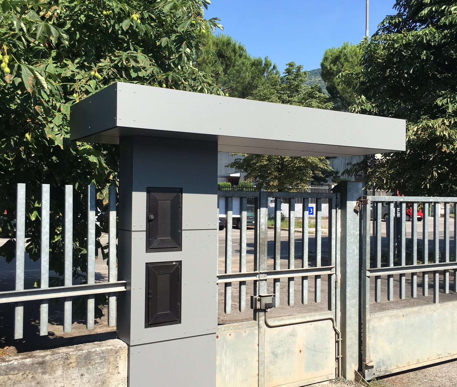 Parapetti in hpl con doghe orizzontali per i balconi e la scalinata. Anche la pensilina è stata rivestita con pannelli hpl della medesima finitura.
