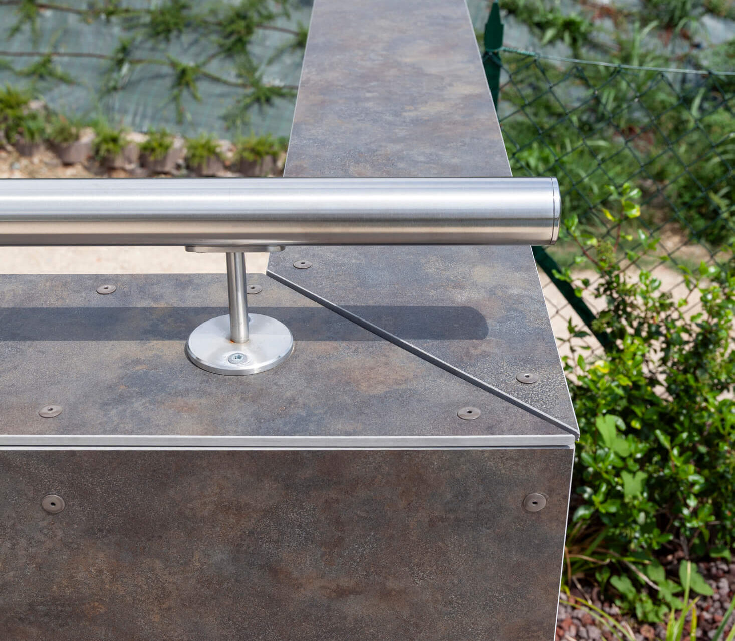 La fase di progettazione è stata curata dai nostri tecnici specializzati che hanno perfezionato ogni minimo particolare e dettaglio, rivestendo la parte superiore del muretto con una lamiera, garantendo una posa a regola d’arte. In aggiunta, abbiamo rivestito la zoccolatura in cemento del parapetto con i pannelli in HPL nella finitura effetto pietra “6015 Burnished Steel”. Questa scelta conferisce all’abitazione un senso estetico di pulizia e modernità.
