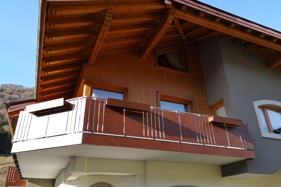 Sostituzione di parapetti in legno alla trentina con pannelli HPL color CORTEN, corrimano in acciaio inox con montanti in alluminio.